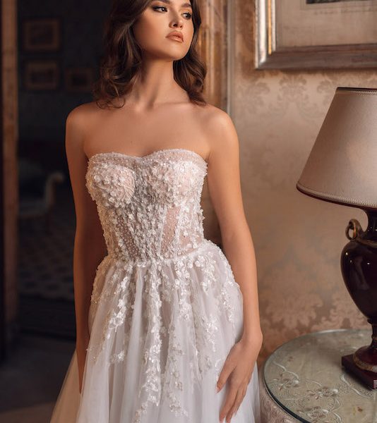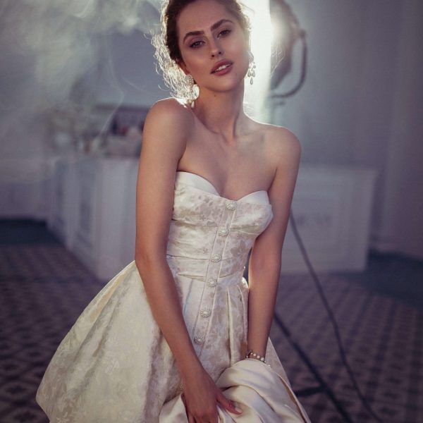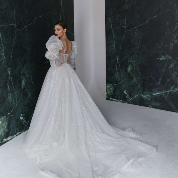 Сукня весільна, з рукавами, з невеликим шлейфом, із застібкою на потайну тасьму-блискавку по середньому шву спідниці. Виконано з сітки, розшитій паєтками на пудровий щільній основі. Сукня безкорсетна, з внутрішніми чашками.