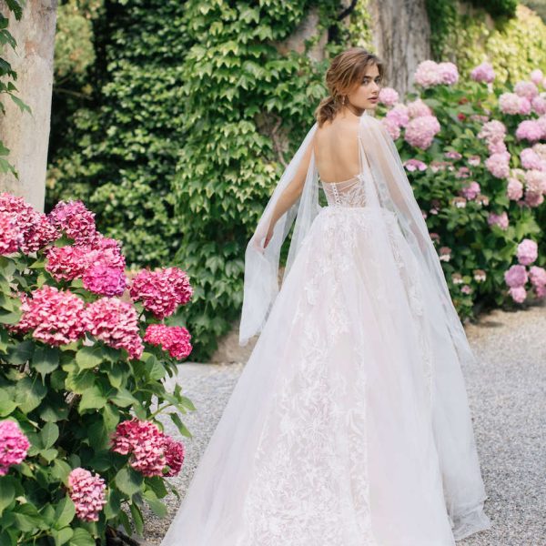 Передня частина сукні з бічними рельєфами, що виходять від лінії пройми і до низу плаття. Верхня частина сукні має V-подібний виріз. Спинка відкрита з фігурним вирізом до лінії талії. Декоративні розшиті елементи проходять по горловині та вирізу спинки. Застібка спинки по горловині на петлі-гудзики. Крій сукні підкреслює жіночні лінії фігури.